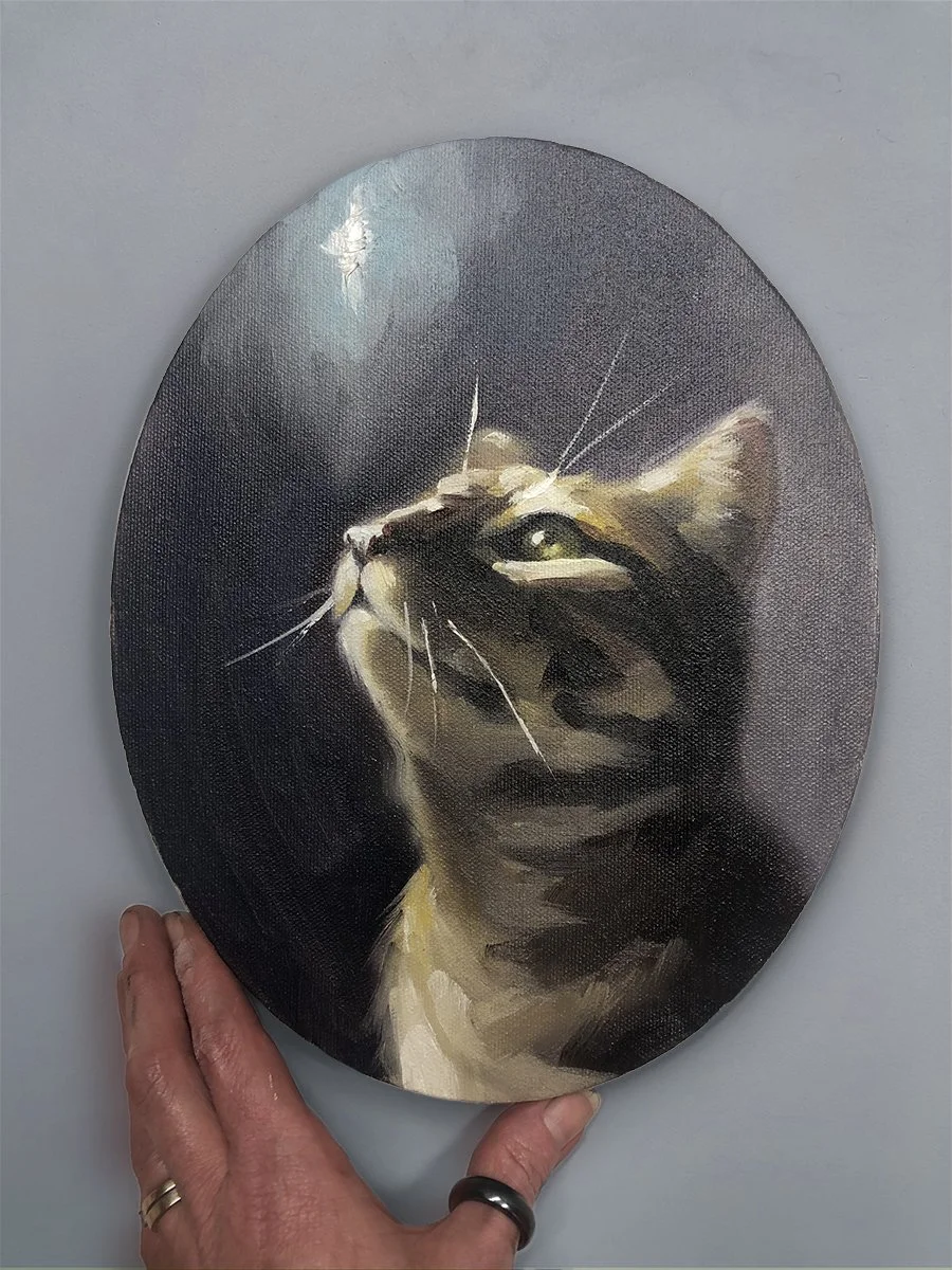 After working in computer animation for over a decade, I yearned for something tactile & tangible. I started painting in oils in 2013, focusing in on still life painting. Painting common everyday items I was interested in capturing a hidden life or character in those inanimate objects . In 2015, I found myself painting some of my friend's pets. Pet portrait commissions are very rewarding for me artistically - challenging, yet so much fun. In 2016 I began exploring themes of human experience in my oil paintings. I narrowed my focus to the power of hands to amplify the importance of actions that lead to life choices. I employ a loose realistic style, with focus on specific details. I love to work with lighting & value to create mood & atmosphere.